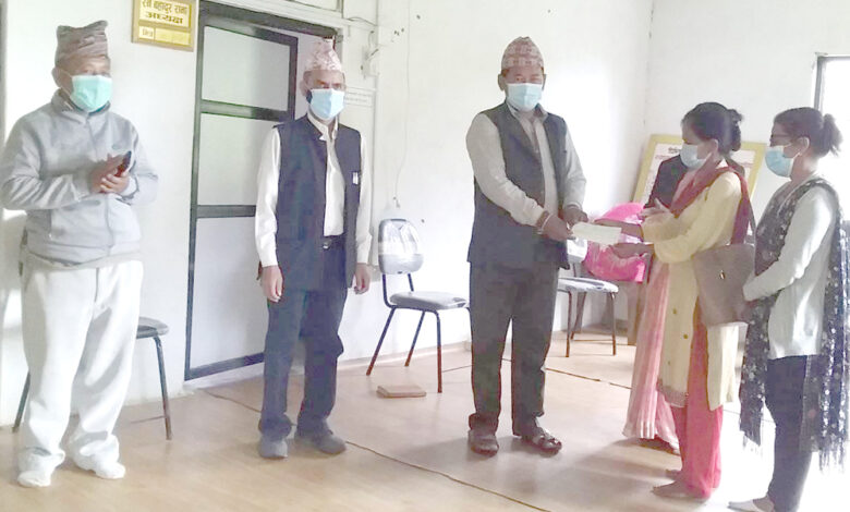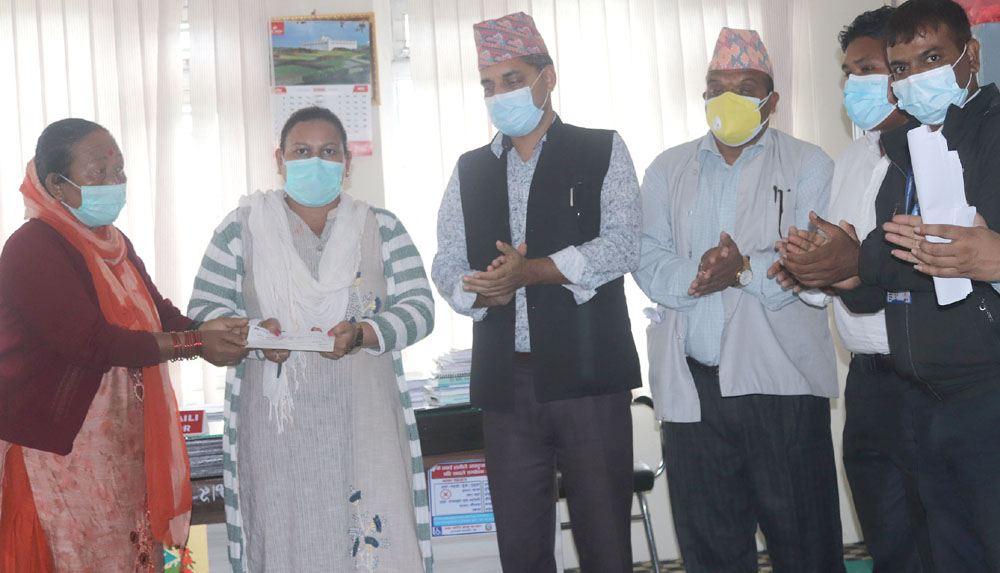 यसैगरी भिमाद नगरपालिकालाई रु चार लाख हस्तान्तरण गरिएको छ । माझकोट महिला बहुउद्देश्यीय सहकारी संस्था, अतिप्रिय सामाजिक उद्यमी सहकारी संस्था, अरुणोदय सामाजिक उद्यमी महिला सहकारी संस्थाको तर्फबाट नगरप्रमुख मेखबहादुर थापालाई उक्त रकमको चेक हस्तान्तरण गरिएको हो । माझकोटकी अध्यक्ष सङ्गीता राना, अतिप्रियकी अध्यक्ष देवी मोक्तान आले र नेपाल एकीकृत ग्रामीण विकास केन्द्रकी अध्यक्ष मनुमाया श्रेष्ठले नगरप्रमुख मेखबहादुर थापालाई उक्त रकमको चेक हस्तान्तरण गर्नुभयो ।