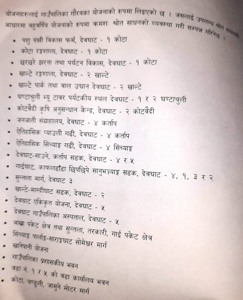 यस्तै, सुन्तला मार्ग, खाल्टे-मास्दीघाट सडक, देवघाट एकिकृत योजना, देवघाट गाउँपालिका अस्पताल, बाख्रा, सुन्तला, तरकारी, गाई पकेट क्षेत्र, सिंच्याङ्ग पार्लाङ्ग -साराङ्गघाट सोमेश्वर मार्ग, खानेपानी योजना, गाउँपालिका प्रशासकीय भवन, वडा नम्बर १ र ५ को वडा कार्यालय भवन, कोटा चण्डुली जामुने मोटर मार्ग समेत गाउँपालिकाको गौरवको योजनामा समावेश गरेको छन् ।
