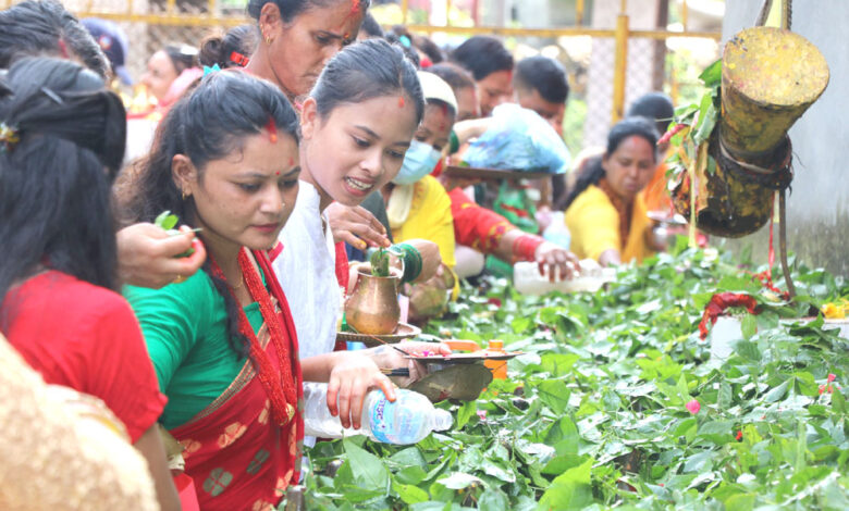 पवित्र तीर्थस्थल देवघाटधाममा स्नानपश्चात् नारायणी नदीकिनारमा रहेको शिव लिङ्गमा बेलपत्र चढाउँदै तीर्थालु । देवघाटमा स्नान गरेपछि भगवान् शिवको पूजा गरेर शिव लिङ्गमा बेलपत्र चढाउँदा मोक्ष प्राप्त हुने जनविश्वास छ । तस्विर : टेकराज पोखरेल/रासस
