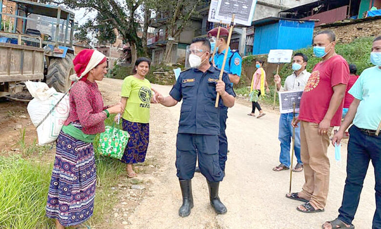 पर्यटकीय नगरी तनहुँको बन्दिपुरमा सर्वसाधारणलाई कोरोना संक्रमणबाट सुरक्षित रहन मास्क लगाउन आग्रह गर्दै मास्क वितरण गर्दै प्रहरी । कोभिड-१९ न्यूनीकरणका लागि प्रहरी, बन्दिपुर पर्यटन विकास समितिले संयुक्त रुपमा बन्दिपुर बजार क्षेत्रमा मास्क वितरण तथा मास्क प्रयोगका विषयमा सचेत गराइएको थियो । तस्विर : भञ्ज्याङ