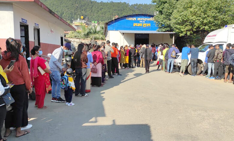 तनहुँको व्यास नगरपालिका परिसरमा आइतबार कोरोना विरुद्धको खोप लगाउन लामबद्ध सर्वसाधारण । नगरपालिकाले २४ स्वास्थ्य संस्थामार्फत् १८ वर्ष भन्दा माथिका नागरिकलाई खोप लगाउन सुरु गरेको छ । तस्विर : निशा थापा मगर/भञ्ज्याङ