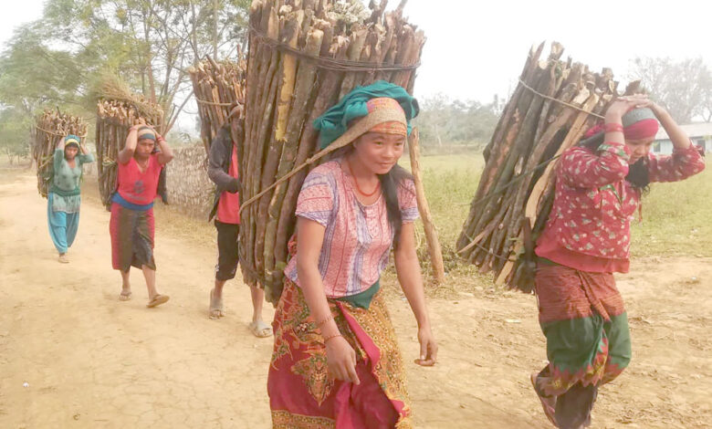 तनहुँको घिरिङ गाउँपालिका-४ जगौलीका महिलाहरु जंगलबाट दाउरा लिएर घरतर्फ फर्कदै । ग्रामीण क्षेत्रमा खाना पकाउन तथा अन्य कामका लागि दाउराको प्रयोग गर्ने गरिन्छ भने महिलाहरु दाउराको जोहो गर्न जंगल जाने गर्दछन् । तस्विर : भञ्ज्याङ