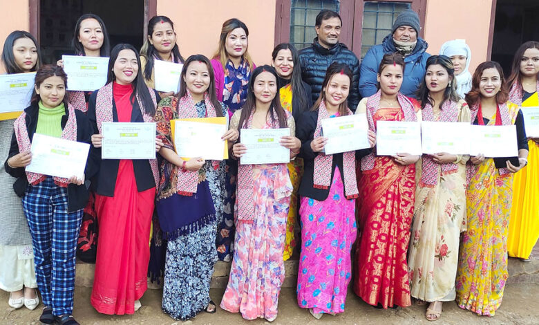 तनहुँको व्यास नगरपालिका-१ भादगाउँमा कालीगण्डकी बहुप्राविधिक शिक्षालयले सञ्चालन गरेको व्युटिसियन तालिमका सहभागीहरु तालिम समापन पश्चात प्रमाणपत्रको साथमा । सामाजिक विकास मन्त्रालयको आर्थिक सहयोगमा महिलालाई आत्मनिर्भर बनाउन तालिम सञ्चालन गरिएको हो । तस्विर : भञ्ज्याङ