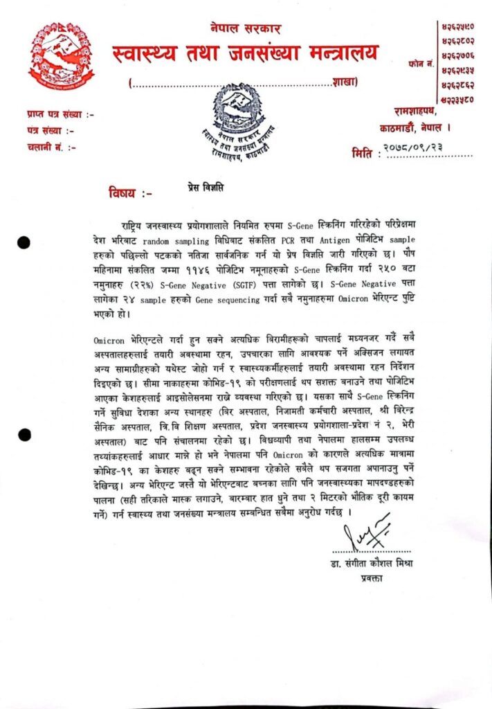 देशभरबाट पीसीआर र एन्टीजेन विधिबाट संकलन गरिएका नमुनालाई जिन सिक्वेन्सिङ गर्दा ती नमुनामा एस-जिन नेगेटिभ पुष्टि भएको हो ।