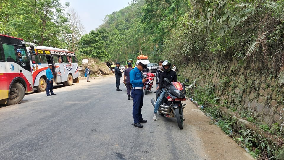 पृथ्वीराजमार्ग अन्तर्गत तनहुँको घाँसीकुवामा सवारी चालकलाई सिमित गतिमा चलाउँना आग्रह गर्दै जिल्ला ट्राफिक प्रहरी कार्यालय तनहुँका एक ट्राफिक प्रहरी । तनहुँ ट्राफिक प्रहरीले पृथ्वीराजमार्ग अन्तर्गत तनहुँ खण्ड तथा बजार क्षेत्रमा सवारी साधन चलाउदा सिमित गतिमा सवारी साधन चलाऔ, सम्भावित दुर्घटनाबाट बाचौं र बचाऔं भन्ने सन्देशमुलक कार्यक्रम सञ्चालन गर्दै आएको छ ।