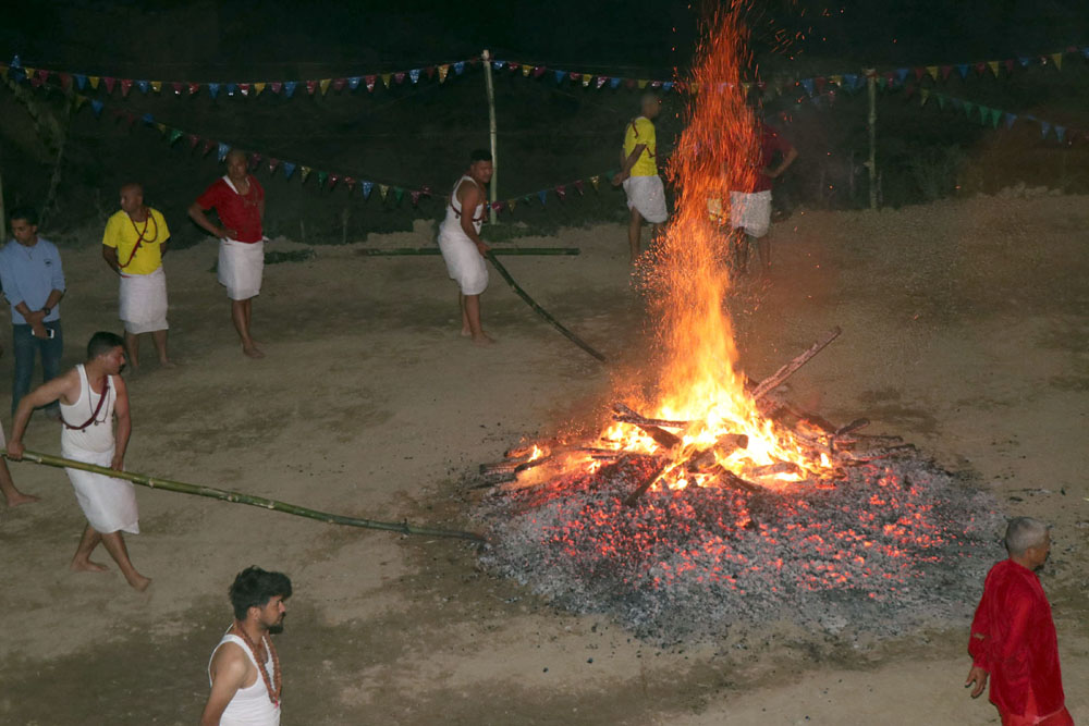 हातमा थाल बजाउँदै उफ्रिरहेका लामो कपाल भएका मूलगुरु धर्मराज खड्का एकैछिनमा आगाको भर्भराउँदो भुङ्ग्रामा लात्तीले हानेर उफ्रिन थाले । त्यसलगत्तै अर्का गुरु साजन थापा आगामा होमिए र त्यसैगरी लात्तीले हाने ।