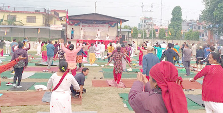 पतञ्जली योग जिल्ला समिति तनहुँले गत शनिबारदेखि दमौली स्थित खल्ला मैदानमा सञ्चालन गरेको वृहत योग विज्ञान शिविरमा योगाभ्यास गर्दै सहभागिहरु । व्यास नगरपालिकाको सहयोगमा सञ्चालित निःशुल्क योग विज्ञान शिविर आज बुधबार बिहान समापन गरिदै छ । तस्विर : निशा थापा मगर/भञ्ज्याङ