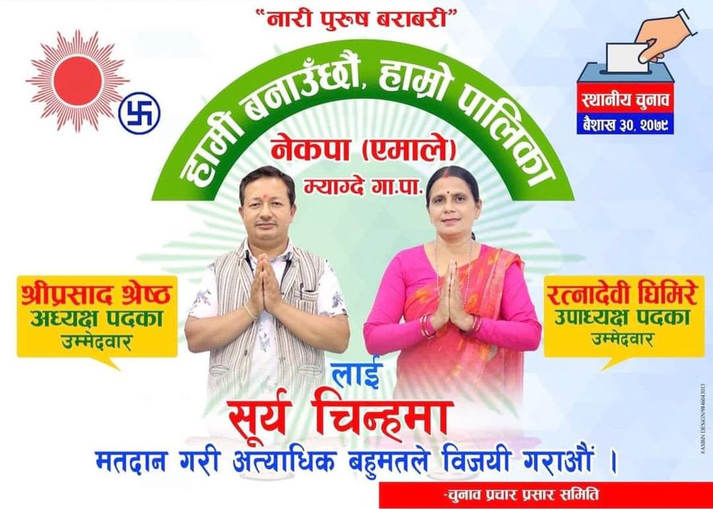 आदरणीय दाजुभाई तथा दिदीवहिनी एवं वुवाआमाहरु, नयाँ वर्ष २०७९ को आगमन सँगै यहि वैशाख ३० गते हुन गईरहेको स्थानिय निर्वाचनको अवसरमा नेकपा एमाले देश र प्रवासमा रहनुभएका सम्पुर्ण नेपाली जनतामा हार्दिक मंगलमय शुभकामना व्यक्त गर्दछु । यो अवसरमा राष्ट्रिय स्वतन्त्रता, सामाजिक न्याय, सङघीय लोकतान्त्रिक गणतन्त्रक स्थापनाका निम्ति आफनो अमुल्य जीवन उत्सर्ग गर्नुहुने सम्पुर्ण शहिदहरु प्रति हाम्रो गौरवशाली पार्टी भावपुर्ण श्रद्धान्जली अर्पण गर्दछु ।