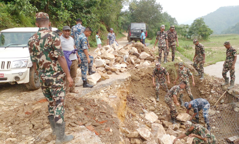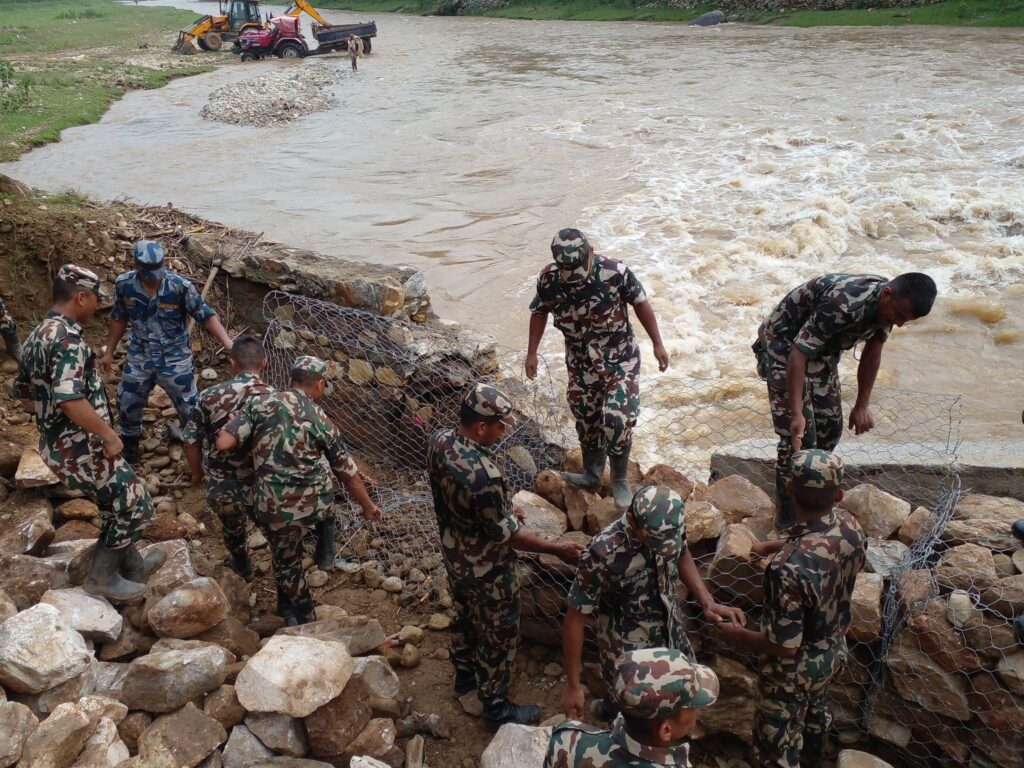 तनहुँको भानु नगरपालिकाको वडा नं. २ र ५ जोड्ने बाङ्गेरहस्थित चुँदीखोलाको पुलको पर्खाल बाढीले भत्काएपछि सोमबार मर्मत सुधार गरिदै नेपाल आर्मी र सशस्त्र प्रहरीहरु । बाढीले पुलमा क्षति पुर्याउँदा भानु मोटर मार्गमा यातायात अवरुद्ध भएपछि भानु नगरपालिका, भानु-१ भन्सारमा रहेको नेपाली सेना, भानु-२ मा रहेको सशस्त्र प्रहरी, स्थानीयको सक्रियतामा ग्याविन जाली भरेर सडक मर्मत गरी यातायात सुचारु गरिएको छ ।