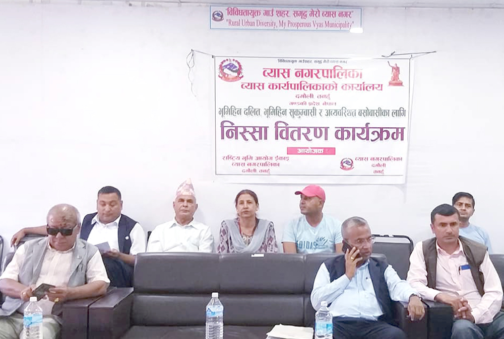 तनहुँको व्यास नगरपालिकाको वडा नं. १ र २ का भूमिहीन दलित, भूमिहीन सुकुम्बासी र अव्यवस्थित बसोवासीहरुलाई निस्सा वितरण गरिएको छ । राष्ट्रिय भूमि आयोग तनहुँले स्थानीय पालिकाहरुसंग समन्वय गरी अहिले निवेदन दर्ता गरेको आधारमा ऐलानी, प्रति जग्गा उपभोग गरिरहेको प्रमाण -निस्सा) वितरण सुरु गरेको हो ।