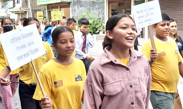 नेल्टा तनहुँले बुधबार दमौलीमा आयोजना गरेको ट्राफिक सचेतना मुलक र्यालीमा ट्राफिक नियम पालना सम्बन्धी सन्देश लेखिएका प्लेकार्ड सहित र्यालीमा सहभागि भएका विद्यार्थीहरु । नेल्टा तनहुँले ट्राफिक प्रहरी कार्यालय तनहुँसंग सहकार्य गरी विद्यार्थीहरुलाई ट्राफिक नियमको पालना तथा सडक दुर्घटना लगायतका विषयमा जानकारी गराएको थियो । तस्विर : भञ्ज्याङ