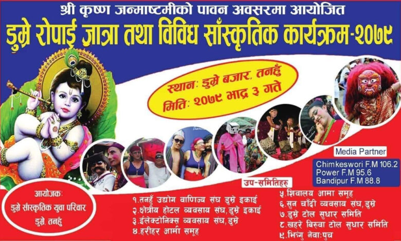 तनहुँको बन्दिपुर गाउँपालिका-१ डुम्रे बजारमा श्री कृष्ण जन्माष्टमी पर्वको अवसरमा डुम्रे रोपाई जात्रा तथा विविध साँस्कृतिक कार्यक्रम २०७९ गरिने भएको छ ।
