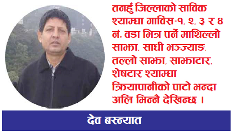 तनहुँ जिल्लाको साविक श्याम्घा गाउँ विकास समितिको वडा नं. १, २, ३ र ४ नं. वडा भित्र पर्ने माथिल्लो साझा, साधी भञ्ज्याङ, तल्लो साझा, साझाटार, शेषटार श्याम्घा क्रियापानीको पाटो भन्दा अलि भिन्नै देखिन्छ । गलाफु भञ्ज्याङ स्थित चितिश्वाँरामा ठकुरी गाउँ, माथिल्लो साँझामा गुरुङगाउँ, साँधी भञ्ज्याङमा नेवार जाति र तल्लो साँझामा ब्राहृमण, क्षत्रीहरुमा नागिला, छिमाल, चंदौला, च्वाई सुवेदी, ढुङ्गाना, घिमिरे, खत्री र अन्य थरहरुमा नेवार, मियाँ, दुरा, कुमाल र दलित जातिहरुको सघन बसोबास रहेको छ ।