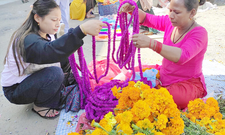 तनहुँको दमौलीमा सोमबार मखमलीको माला खरिद बिक्री गरिदै । भाईटिकाका दिन दिदीबहिनीहरुले दाजुभाईलाई टिका लगाएर मखमली, सयपत्री लगायतका फूलका माला लगाइदिने परम्परा छ । तनहुँमा यस वर्ष एउटा माला १५० रुपैयाँसम्ममा खरिदबिक्री भएको छ । तस्विर : नारायण खड्का/भञ्ज्याङ