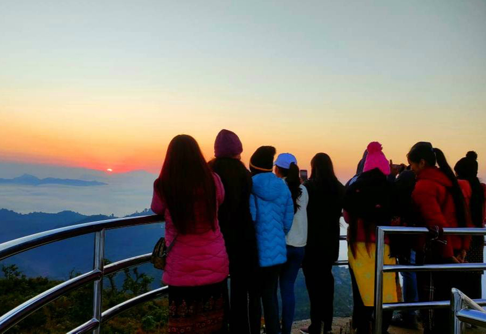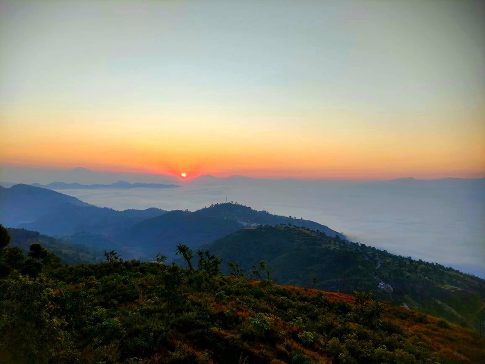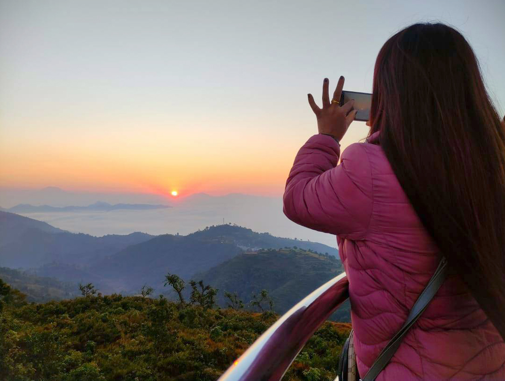 तनहुँको ऋषिङ गाउँपालिकाको गढीडाँडाबाट प्राकृतिक सुन्दरता अवलोकन गर्दै युवायुवतीहरु ।