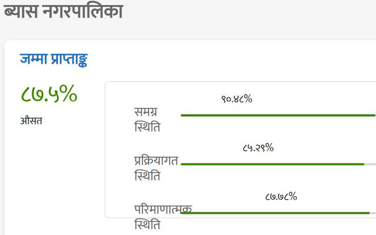 यस्तै, नगरपालिकाले शासकीय प्रवन्धमा ९४.४४ प्रतिशत, संगठन तथा प्रशासनमा ८७.५ प्रतिशत, बार्षिक बजेट तथा योजनामा व्यवस्थापनमा ९०.९१ प्रतिशत, बित्तिय एवं आर्थिकमा १०० प्रतिशत, सेवा प्रवाहमा ९३.७५ प्रतिशत र न्यायिक कार्य सम्पादनमा शतप्रतिशत नतिजा हासिल गरेको बताइएको छ ।