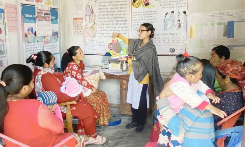 तनहुँको भानु नगरपालिका-१२ कवाजित स्थित सामुदायिक स्वास्थ्य इकाइमा स्थानीय महिलाहरुलाई सरसफाई तथा स्वास्थ्य सम्बन्धी सहजिकरण गर्दै स्वास्थ्यकर्मी ।