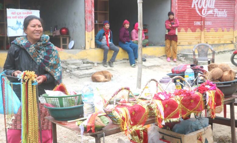 तनहुँको शुक्लागण्डकी नगरपालिकाको ढोरफिर्दी स्थित पवित्र धार्मिक स्थल ढोरवाराही मन्दिर दर्शन गर्न आउने भक्तजनलाई लक्षित गरी पुजा सामाग्रि बिक्री वितरणका लागि लिएर बसेकी स्थानीय एक महिला । तस्विर : भञ्ज्याङ