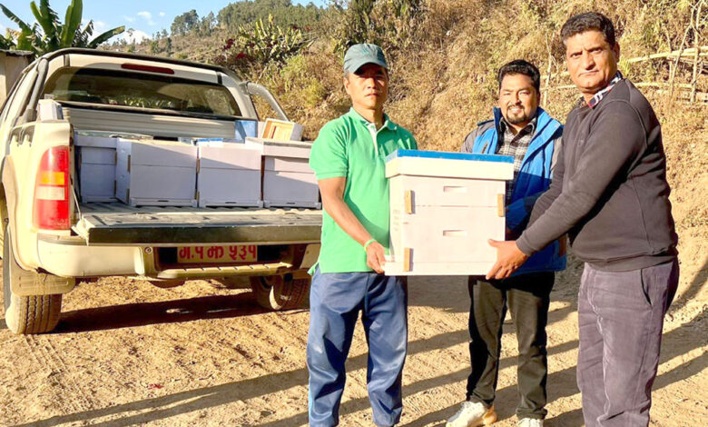 तनहुँको ऋषिङ्ग गाउँपालिका-१, गैराखुदीका रामबहादुर थापा मगरलाई आधुनिक मौरीको घार हस्तान्तरण गर्दै कृषि ज्ञान केन्द्र तनहुँका बागवानी विकास अधिकृत वीरेन्द्र धिताल र लेखा अधिकृत विजयकुमार श्रेष्ठ । पैसाको अभावले मुढे घारमा मौरीपालन गर्दै आएका मगरलाई केन्द्रले प्रविधि पर््रदर्शन कार्यक्रम अन्तर्गत १० वटा आधुनिक मौरीको घार प्रदान गरेको छ । तस्विर : भञ्ज्याङ