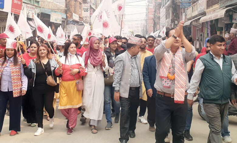 वैशाख १० गते तनहुँ-१ को प्रतिनिधिसभा सदस्यका लागि हुने उपनिर्वाचनका लागि मंगलबार सदरमुकाम दमौली बजार क्षेत्रमा मतदाताको घरदैलोमा पुगेर मत माग्दै नेकपा एमालेका तर्फबाट उम्मेदवार सर्वेन्द्र खनालसहित नेता तथा कार्यकर्ता। तस्बिर : भञ्ज्याङ