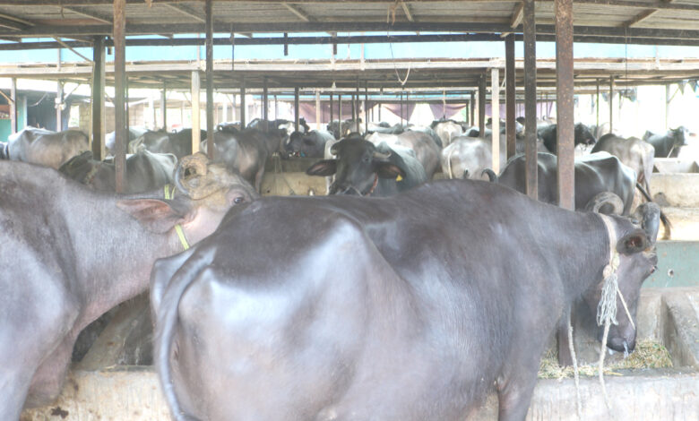 फार्ममा पाडापाडीसमेत गरी एक सय भैंसी रहेका छन् भने दैनिक ३५० लिटर दूध उत्पादन गरी बिक्री वितरण गर्दै आइएको छ । तस्विर : नारायण खड्का/भञ्ज्याङ
