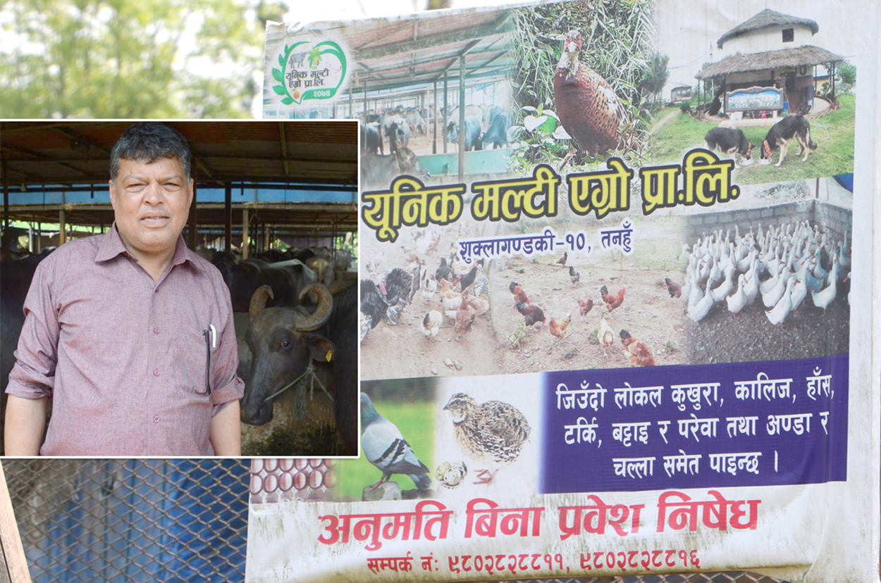 तनहुँको शुक्लागण्डकी नगरपालिका-१० गैराबारीस्थित युनिक बहुउद्देश्यीय कृषि फार्ममा पालिएका भैसी । करिब ११ करोड रुपैयाँको लगानिमा १०३ रोपनी क्षेत्रफलमा सञ्चालन गरिएको कृषि फार्ममा भैसीसंगै कालिज, हाँस, लोकल कुखुरा पालन गरिएको फार्मका प्रबन्ध निर्देशक हरि खड्काले बताए ।