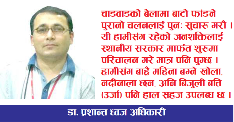तर हामीको ध्यान नपुग्दा तलको तटीय खेतहरु अब छिटै बगरमा परिणत हुने अबस्था आइसकेको छ । अब ढुंगा निस्कनन भनेर छोडेका खाल्टालाई, त्यही छोडिएका माटोको गेग्रानले पुर्न सक्ने स्थिति थियो, तर त्यो गरीयन । तसर्थ, स्थानीय सरकारले ढुंगाखानी संचालकलाई यस्ता मामिलामा जिम्मेवारबोध बनाउनु पर्दछ । किनकी, सबै अवस्था अझै गम्भीर भईसकेको छैन। अर्कोतिर, बनमा रहेको नांगो भागमा सकिन्छ भने स्थानीय सरकार मार्फत उपयुक्त ठाउँहरुमा नयाँ पोखरी थप्दै जाँउ, नभए पुरानालाई भयपनि ब्युताउ । चाडवाडको बेलामा बाटो फांडने पुरानो चलनलाई पुनः सुचारु गरौ । यी हामीसंग रहेको जनशक्तिलाई स्थानीय सरकार मार्फत शुरुमा परिचालन गरे मात्र पनि पुग्छ ।