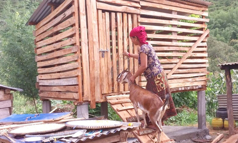 तनहुँको आँबुखैरेनी गाउँपालिका-१ भुजेलगाउँका एक महिला बाख्रालाई खोरमा थुन्दै । विपन्न वस्तीमा मुख्यमन्त्री कार्यक्रम मार्फत यहाँका कृषकलाई आधुनिक खोर निर्माणका साथै बाख्रा, मौरी सहयोग गरिएको छ । तस्विर : भञ्ज्याङ