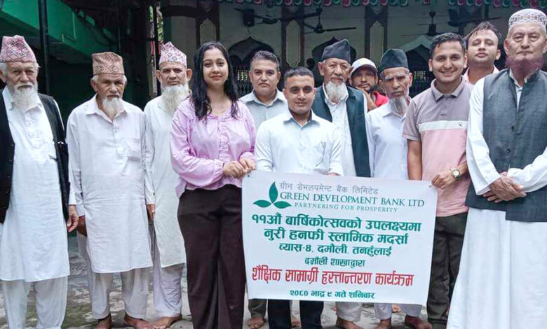 व्यास नगरपालिका-४ स्थित नुरी हन्फि स्लामिक मदर्सालाई विभिन्न शैक्षिक सामाग्री हस्तान्तरण गरिएको छ । ग्रिन डेभलपमेन्ट बैंकको ११औ वार्षिकोत्सवको उपलक्ष्यमा दमौली शाखाले सामाजिक उतरदायित्व अन्तर्गत मुस्लिम समुदायको मदर्सालाई शैक्षिक सामाग्री वितरण गरिएको शाखा प्रवन्ध सुदिप न्यौपानेले बताए ।