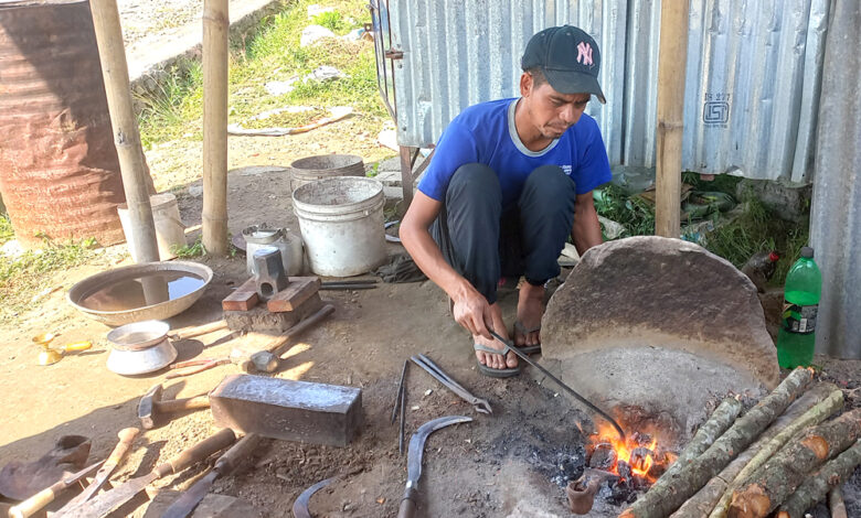 पोखरा महानगरपालिका-१७ ढुंगुसाघुमार्गको विपलतरास्थित आरनमा फलामका सामग्री निर्माण गर्दै भरत विश्वकर्मा । विदेशबाट फर्केका उनका लागि यतिखेर मौलिक पेशा आरन जीविकोपार्जनको आधार बनेको छ । तस्बिर : हरिप्रसाद बास्तोला/रासस