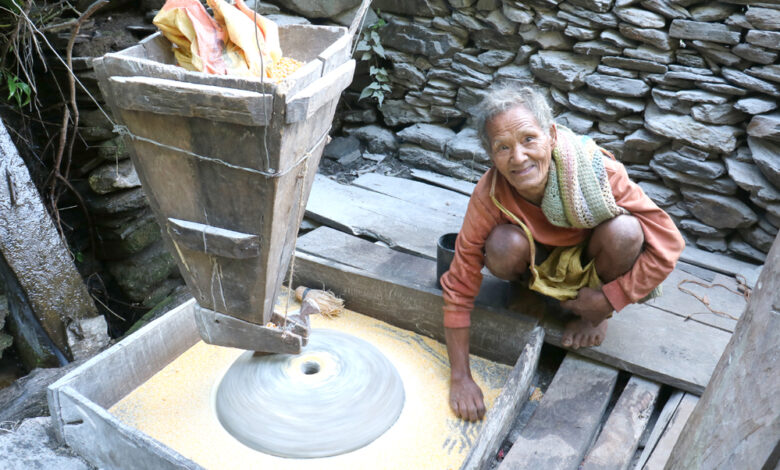 चितवनको कालिका नगरपालिका-१० स्थित पाइमाराङ खोलामा रहेको पानीघट्टमा मकै पिस्दै दमियो डाँडाका ७८ वर्षीय बृद्ध नरबहादुर प्रजा । यस भेगका चेपाङ समुदाय यही पानीघट्टमा मकै, कोदो पिस्न आउने गरेका छन् । तस्बिर : कृष्ण आचार्य/रासस