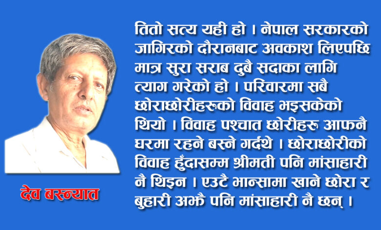 तितो सत्य यही हो । नेपाल सरकारको जागिरको दौरानबाट अवकाश लिएपछि मात्र सुरा सराब दुबै सदाका लागि त्याग गरेको हो । परिवारमा सबै छोराछोरीहरुको विवाह भइसकेको थियो । विवाह पश्चात छोरीहरु आफनै घरमा रहने बस्ने गर्दथे । छोराछोरीको विवाह हुँदासम्म श्रीमती पनि मांसाहारी नै थिइन । एउटै भान्सामा खाने छोरा र बुहारी अझै पनि मांसाहारी नै छन् । छोरा बि फार्मेसी र बुहारी वि.एन अध्ययनका लागि चितवन भरतपुर गएका थिए । दुइ/तीन महिनाको अन्तरालमा आउने छोरा बुहारीसंग कमै मात्र भेटघाट हुने गर्दथ्यो । अहिले छोरा बुहारी नाति समेत अष्ट्रेलियामा पुगेका छन् । हामी बूढाबूढी दुइजना घरका रैथाने नै भएका छौं । छोराछोरी बुहारीसंग लामो अन्तरालमा मात्र भेटघाट हुने गर्दथ्यो। मांसाहारी र शाकाहारी बीच महिनौंको अन्तरालमा भेट हुँदा उनीहरुको लागि विशेष मांसाहारी परिकार बन्ने नै गर्दथ्यो ।