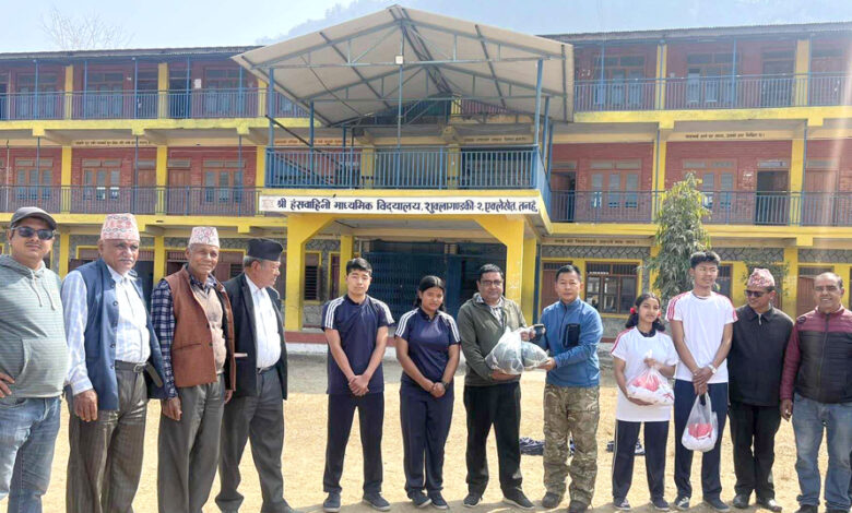 हंशवाहिनी मावि प्रांगणमा मंगलबार आयोजित कार्यक्रममा पोशाक हस्तान्तरण गर्दै समाजका पूर्व अध्यक्ष भीमराज गुरुङले तनहुँ समाज हङकङ विद्यार्थीको शारीरिक विकासका लागि प्रतिबद्ध रहेको बताए ।