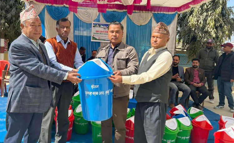तनहुँको म्याग्दे गाउँपालिका-२ राधा माध्यमिक विद्यालयलाई डस्टवीन हस्तान्तरण गर्दै लायन्स क्लब अफ तनहुँ म्याग्देका अध्यक्ष गौरवराज राना । क्लबले सामाजिक उत्तरदायित्व वहनअन्तर्गत विद्यालयलाई सहयोग गरेको हो । तस्बिर : भञ्ज्याङ
