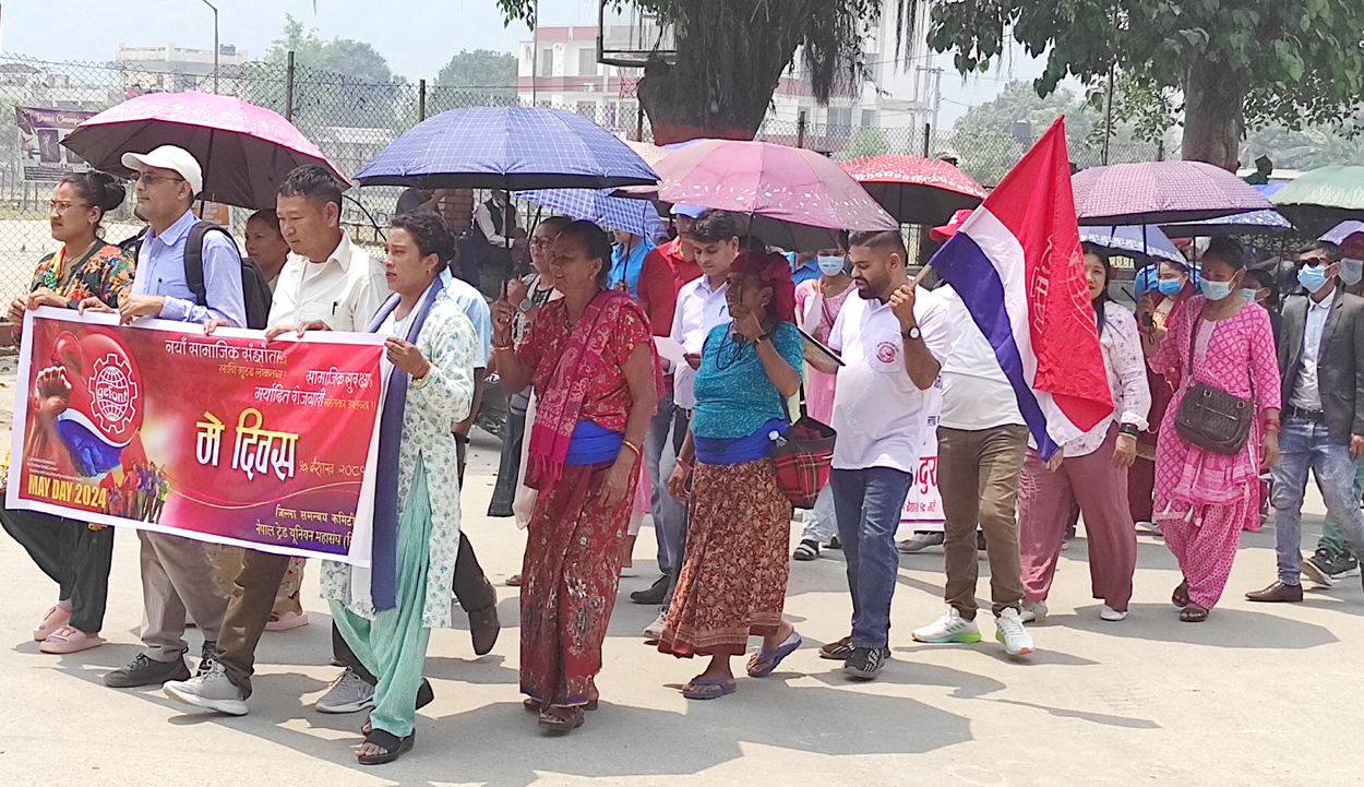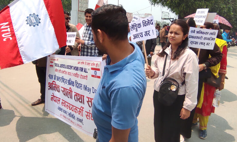 अन्तर्राष्ट्रिय श्रमिक दिवसका अवसरमा नेपाल ट्रेड युनियन कांग्रेस तनहुँले बुधबार दमौलीमा निकालेको र्यालीमा विभिन्न माग लेखिएका प्लेकार्ड सहित सहभागि भएका नेपाल स्वास्थ्यकर्मी संघ तनहुँमा आवद्ध श्रमिकहरु ।