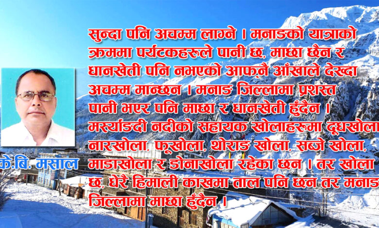 सुन्दा पनि अचम्म लाग्ने । मनाङको यात्राको क्रममा पर्यटकहरुले पानी छ, माछा छैन र धानखेती पनि नभएको आफ्नै आँखाले देख्दा अचम्म मान्छन । मनाङ जिल्लामा प्रशस्त पानी भएर पनि माछा र धानखेती हुँदैन । मर्स्याङदी नदीको सहायक खोलाहरुमा दूधखोला, नारखोला, फूखोला, थोराङ खोला, सब्जे खोला, माडाखोला र डोनाखोला रहेका छन । तर खोला छ, धेरै हिमाली काखमा ताल पनि छन तर मनाङ जिल्लामा माछा हुँदैन । नदी र खोला किनार र ताल जस्तो समस्थल जमिनमा पनि धानको खेती हुँदैन । मनाङमा अरु जिल्लामा जस्तै सबै जातजातिहरुको पनि बसोवास छैन । केवल गुरुङ र तिब्बती मूलका भोटे जातिहरुको मात्र बसोवास छ । मनाङमा जग्गा जमिन बेजिल्लाका नागरिकहरुलाई बिक्री गरिदैन । उपल्लो मनाङमा पर्यटकहरुले मिथेवा प्रथाको रुचिपूर्वक अध्ययन गर्दछन । मनाङ उपत्यकामा बस्ने मानिसहरुलाई नेस्याङपा पनि भनिन्छ । नेस्याङपाहरुमा अगुवाको रुपमा सामाजिक नेतृत्व गर्न मिथेवा प्रथा रहेको छ । मिथेवालाई गाउँको अगुवाको रुपमा मान्ने गरिन्छ । मिथेवा प्रथाले गाउँमा रीतिथिति बसाल्ने र मिथेवा प्रथाबाट बनेका नियम उल्लंघन गर्नेहरुलाई दण्ड, जरिवाना गरिन्छ ।