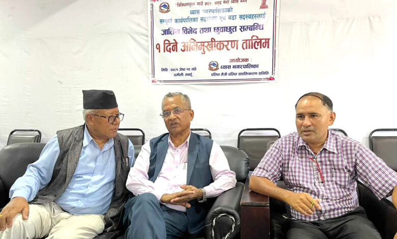 तनहुँको व्यास नगरपालिकामा जातीय विभेद तथा छुवाछूत सम्बन्धी अभिमुखिकरण गरिएको छ । नगरका वडा अध्यक्षहरू तथा कार्यपालिका सदस्य एवं वडा सदस्यहरूलाई जातीय विभेद तथा छुवाछूत सम्बन्धी १ दिने अभिमुखिकरण कार्यक्रम गरिएको हो ।