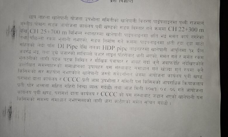 छाप नाहाला खानेपानी योजना उपभोक्ता समितिले विज्ञप्ति जारी गर्दै ती कार्यालयको धाराको लाईन काटेको जनाएको छ । पृथ्वीराजमार्ग मुग्लिन पोखरा सडक आयोजना कार्यालय पूर्वी खण्डको सडक विस्तार गर्ने क्रममा उक्त खानेपानी योजनाको खानेपानी वितरणको पाइपलाइनमा विभिन्न स्थानहरुमा खानेपानी पाईपलाइनमा क्षति हुँदा समेत मर्मत कार्य नगरेको तथा पछिल्लो रकम भुक्तानी नभएकाले उक्त कार्यालयहरुको धारा काटिएको समितिका अध्यक्ष ईमनाथ खनालले बताए ।
