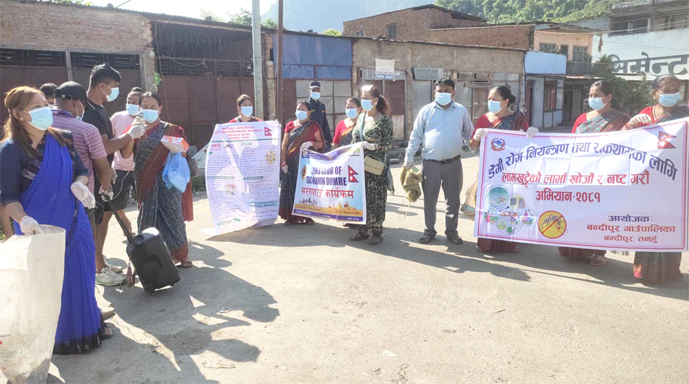 अभियान अन्तर्गत तनहुँको व्यवसायिक केन्द्र डुम्रे बजारमा डेंगी रोग सम्बन्धी सचेतनामूलक तथा सरसफाई कार्यक्रम गरिएको वडा नं. १ का अध्यक्ष एवं गाउँपालिकाका प्रवक्ता शिवकुमार श्रेष्ठले बताए । बन्दीपुर–१ कार्यालयको आयोजनामा वडाका विभिन्न टोलमा सचेतना मुलक कार्यक्रमसंगै सरसफाई र खोज र नष्ट गर कार्यक्रम गरिएको उनले बताए ।