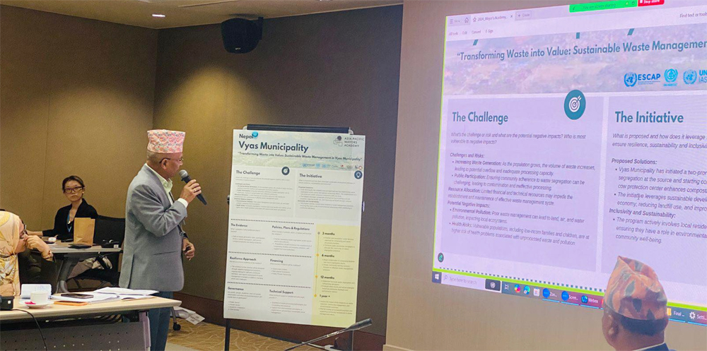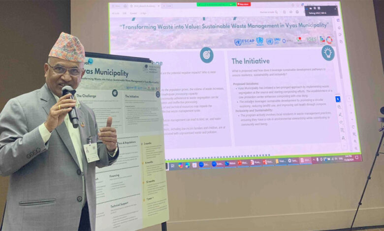 व्यास नगरपालिकाका प्रमुख वैकुण्ठ न्यौपानेले सरसफाई व्यवस्थापनको विषयमा नगरपालिकाले गरेका काम र सामना गरिएका चुनौतीहरूबारे प्रस्तुतिकरण गरेका छन् । थाइल्याण्डको बैंककमा हालै सम्पन्न एशिया प्यासिफिक मेयर्स एकेडेमीको समापन समारोहमा न्यौपानेले सरसफाई व्यवस्थापन सम्बन्धि प्रस्तुतीकरण गरेका हुन् ।