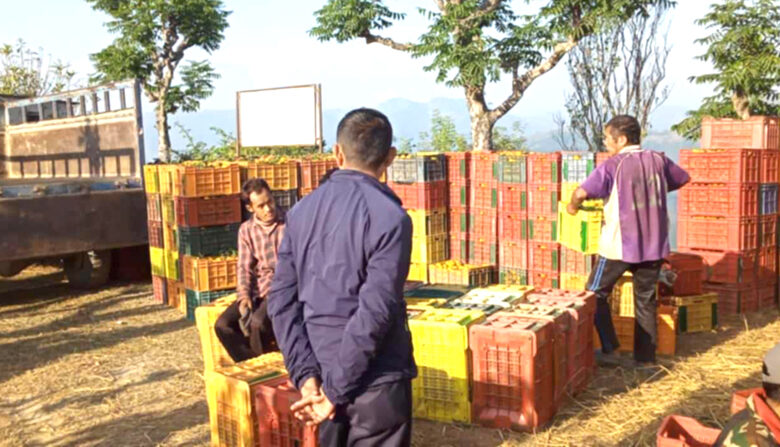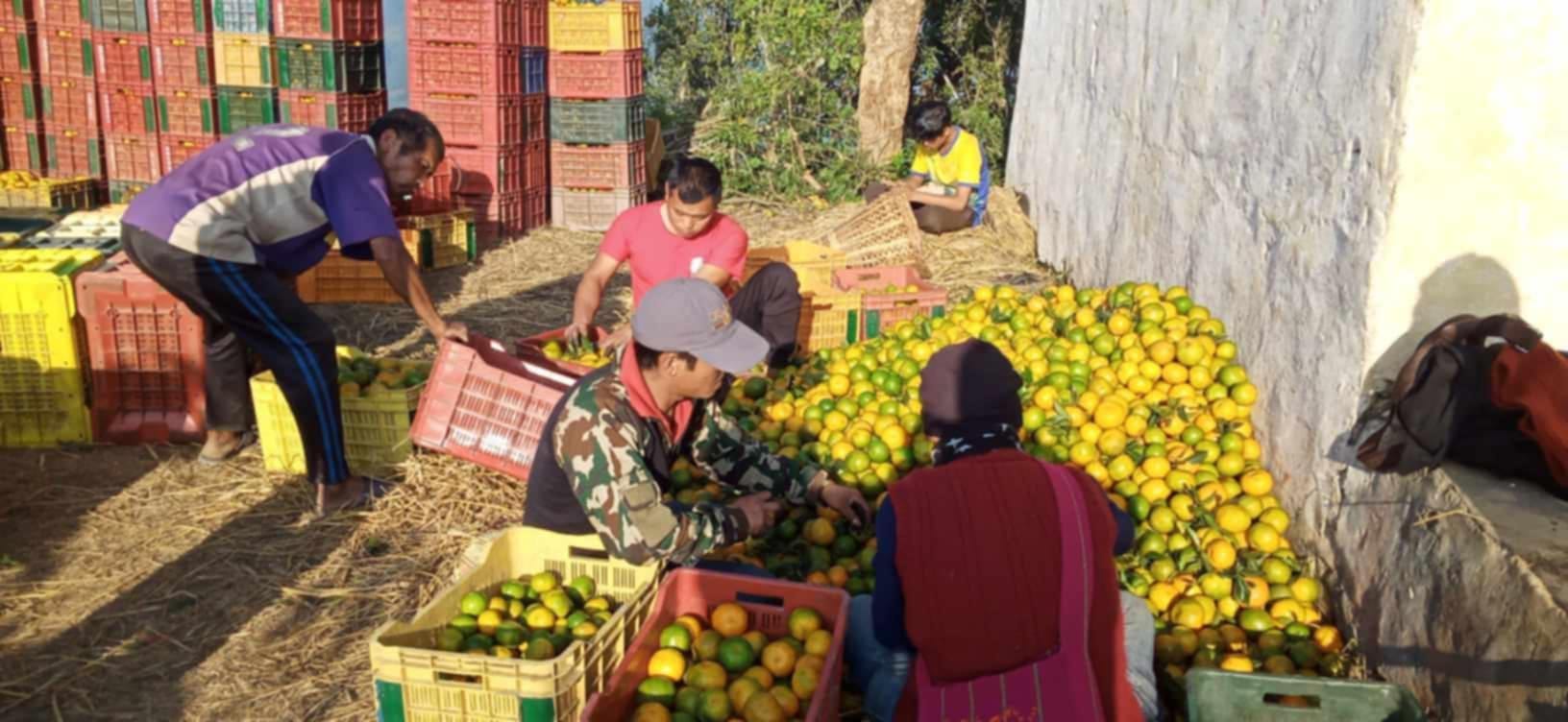 तनहुँको म्याग्दे गाउँपालिका–४ स्थित छाङमा उत्पादित सुन्तला बजार पठाउने तयारी गर्दै व्यापारीहरु ।