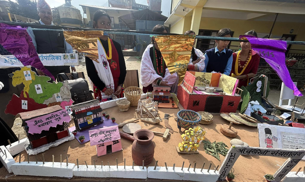 तनहुँको आँवुखैरेनी गाउँपालिकाले आयोजना गरेको शैक्षिक सामग्री प्रदर्शनी मेलामा पालिकाका विभिन्न विद्यालयका विद्यार्थीले तयार गरेका शैक्षिक सामाग्रीहरु ।