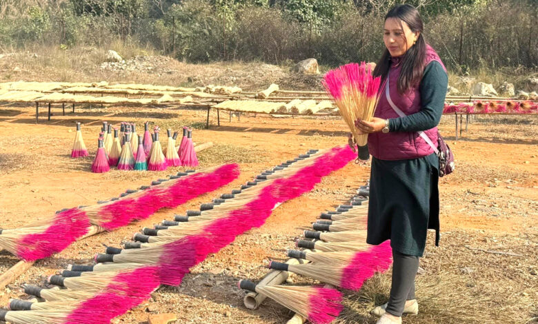 तनहुँको आँवुखैरेनी गाउँपालिकाले सञ्चालन गरेको औद्योगिक ग्राममा स्थानीयस्तरमै उपलब्ध बाँसबाट तयार गरिएको कुचोको अवलोकन गर्दै गाउँपालिकाकी उपाध्यक्ष दुर्गा अर्याल । गाउँपालिकाले उद्योगबाट उत्पादन गरिएको बासजन्य वस्तुबाट उत्पादित कुचो लगायतका सामाग्रि बजारीकरणको व्यवस्था मिलाउँदै आएको छ ।