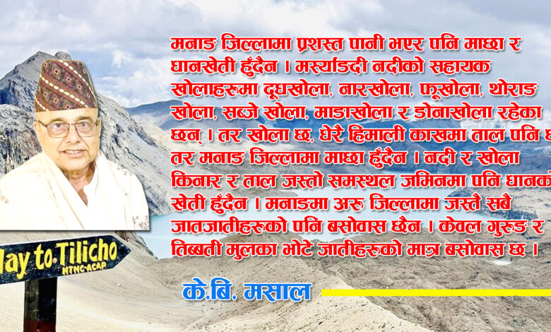 मनाङ जिल्लामा प्रशस्त पानी भएर पनि माछा र धानखेती हुँदैन । मस्र्याङदी नदीको सहायक खोलाहरुमा दूधखोला, नारखोला, फूखोला, थोराङ खोला, सब्जे खोला, माडाखोला र डोनाखोला रहेका छन्। तर खोला छ, धेरै हिमाली काखमा ताल पनि छ तर मनाङ जिल्लामा माछा हुँदैन । नदी र खोला किनार र ताल जस्तो समस्थल जमिनमा पनि धानको खेती हुँदैन । मनाङमा अरु जिल्लामा जस्तै सबै जातजातीहरुको पनि बसोवास छैन । केवल गुरुङ र तिब्बती मुलका भोटे जातीहरुको मात्र बसोवास छ । मनाङमा जग्गा जमिन बेजिल्लाका नागरिकहरुलाई बिक्री गरिदैन । उपल्लो मनाङमा पर्यटकहरुले मिथेवा प्रथाको रुचिपूर्वक अध्यन गर्दछन । मिथेवालाई गाउँको अगुवाको रुपमा मान्ने गरिन्छ । मिथेवा प्रथाले गाउँमा रितिथिती बसाल्ने र मिथेवा प्रथाबाट बनेका नियम उल्लंघन गर्नेहरुलाई दण्ड, जरिवाना गर्ने गरिन्छ ।