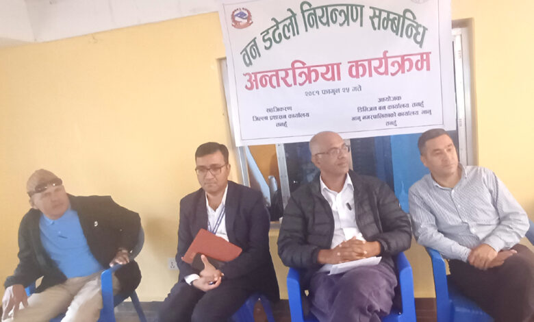 गर्मियाम सुरु भएसँगै वन क्षेत्रमा हुने डढेलो नियन्त्रणका लागि सतर्कता अपनाउन तथा सचेतनाका लागि सरोकारवालाहरुसँग अन्तरक्रिया गरिएको हो । डिभिजन वन कार्यालय तनहुँका प्रमुख शरद कुमार अधिकारीको अध्यक्षतामा आयोजित कार्यक्रममा भानु नगरपालिकाका नगर प्रमुख आनन्दराज त्रिपाठीले डँढेलो नियन्त्रणसँगै वन संरक्षणमा उपभोक्ताहरुको भूमिका महत्वपूर्ण रहने बताए ।