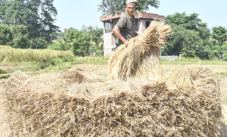 तनहुँको आँवुखैरेनी गाउँपालिका-१ सत्रसय फाँटका एक कृषक धानको कुनियो बनाउँदै ।