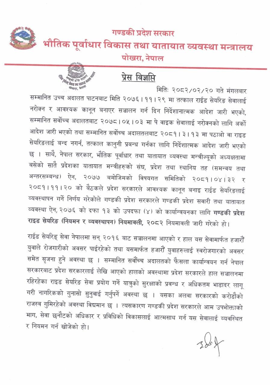 राइड सेयरिङ नियमावली कार्यान्वयनको निर्णयबाट गण्डकी प्रदेश सरकार तत्काललाई पछि हटेको छ । मंगलबार बसेको मुख्यमन्त्री, मन्त्री, वार्ता समितिबीचको संयुक्त बैठकले राइड सेयरिङ (नियमन तथा व्यवस्थापन) नियमावली, २०८२ एक महिनालाई कार्यान्वयन नगर्ने निर्णय गरेको हो ।