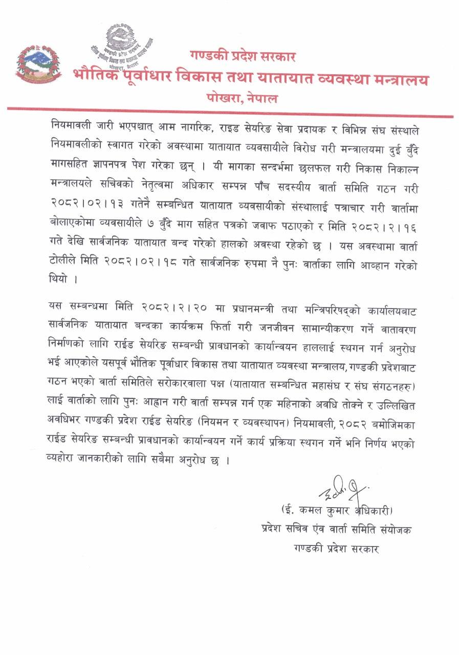 संघ सरकार र सिन्डिकेट पक्षधर व्यवसायी सम्मिलित कार्यदलले सोमबार मध्यरातसम्म छलफल गरी राइड सेयरिङ नियमावली स्थगित गर्न गण्डकी सरकारलाई पत्राचार गर्ने सहमति गरेको थियो ।