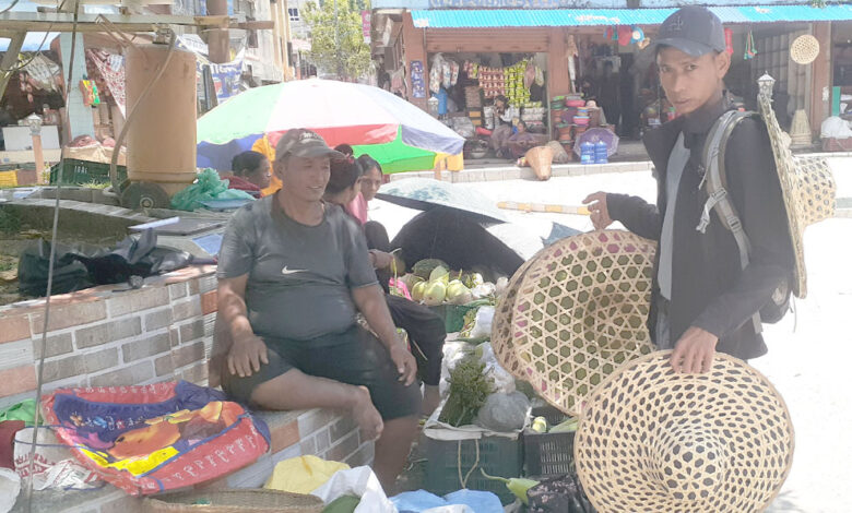 गोरखाको पालुङ्गटारबाट छत्री ल्याएर तनहुँको दमौलीमा बिक्री गर्दै एक युवा व्यापारी । विशेष गरी कृषिकर्म गर्दा घाम र पानीबाट जोगिन टाउँकोमा राखेर काम गरिने चोयाबाट बुनेको छाता आकारको छत्री प्रयोग गर्ने गरिन्छ । प्रति गोटा पाँच सय रुपैयाँ मूल्यमा बिक्री गर्न बजार ल्याएको छत्री पछिल्लो समय प्रयोग लोप हुँदै गएको छ । तस्विर : सानेबहादुर नेपाली/रासस