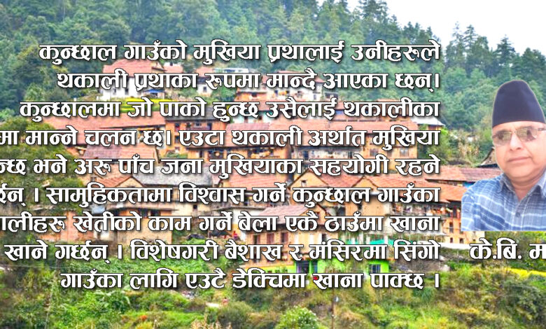 नेपालका मुखिया प्रथाहरु अन्त भएको धेरै बर्ष भयो । तर कुन्छाल गाउँमा भने अझैपनी गाउँमाथिको डाँडोमा गएर उर्दि लगाउने गर्छन । उर्दि लगाएपछि सबै भनेको ठाउँमा जम्मा हुनु पर्दछ । कुन्छाल गाउँ माथी डाँडामा गएर आज फलानोको रोपाई छ है, भनेर कराएपछि सबै जुटछन। खेत खन्ने बेला, धान गोडने बेला वा धान रोप्ने बेलामा उर्दिका भरमा सिंगो गाउँ जम्मा हुने गर्छ । कुन्छाल गाउँको मुखिया प्रथालाई उनीहरुले थकाली प्रथाका रुपमा मान्दै आएका छन्। कुन्छालमा जो पाको हुन्छ उसैलाई थकालीका रुपमा मान्ने चलन छ । एउटा थकाली अर्थात मुखिया हुन्छ भने अरु पाँच जना मुखियाका सहयोगी रहने गर्छन्। सामुहिकतामा विश्वास गर्ने कुन्छाल गाउँका गोपालीहरु खेतीको काम गर्ने बेला एकै ठाउँमा खाना खाने गर्छन् । विशेषगरी बैशाख र मंसिरमा सिंगो गाउँका लागि एउटै डेक्चिमा खाना पाक्छ ।
